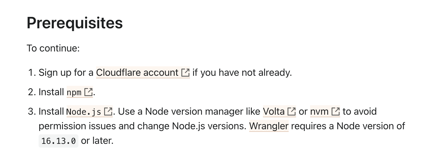 깔려있어야 하며 3. 노드 16.13.0 이상의 버전이 있어야한다. wrangler를 사용하게 될텐데 이걸 위해서 버전을 잘 살펴야한다 요즘은 웬만하면 20대 버전으로 깔리니 걱정하지 않아도 좋을 것이다.